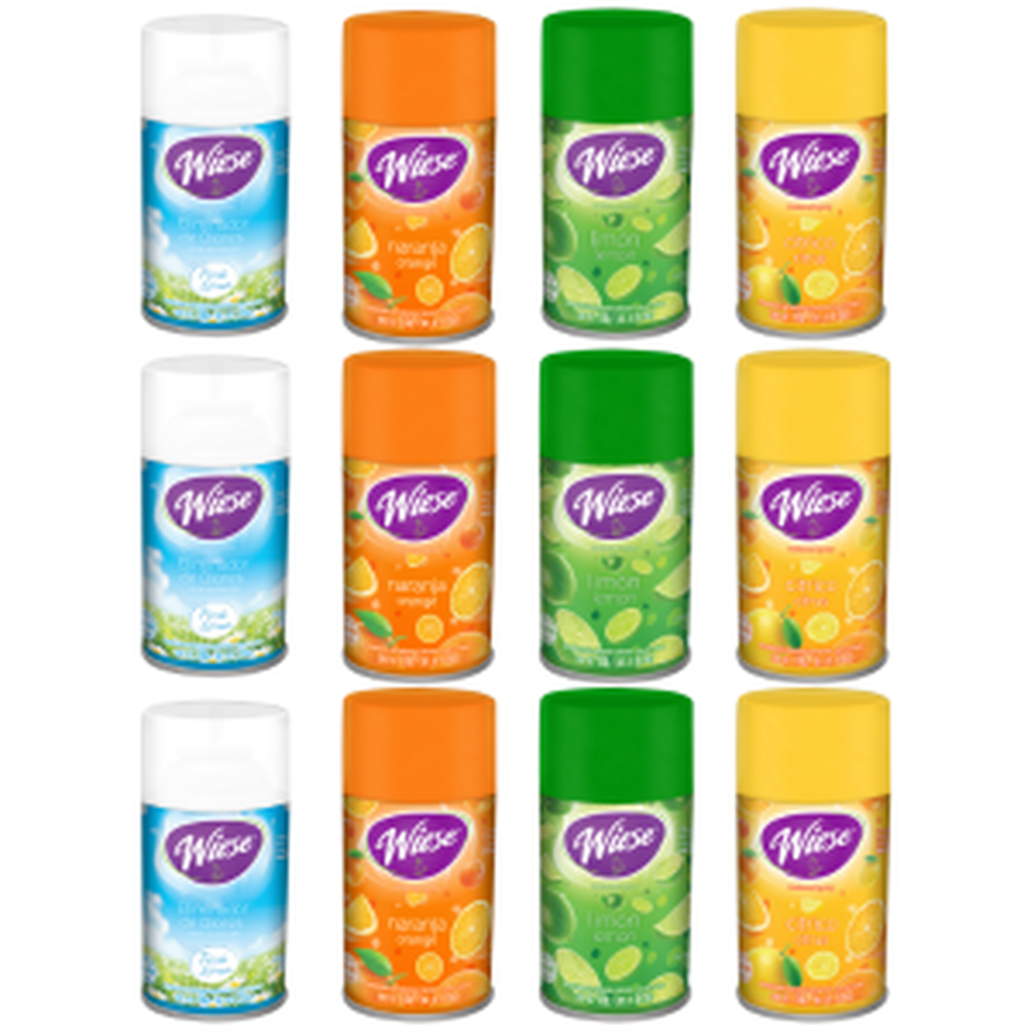 Este kit incluye 12 aromatizantes Wiese 180g/256ml pensados para control de olores y fragancias frescas:
